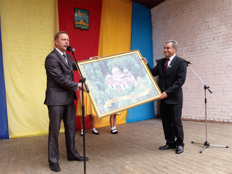 Новгородской области Митина С.Г. передал в дар Главе района Саляеву В.И. картину с изображением Рдейского монастыря, как символа